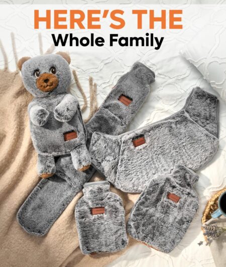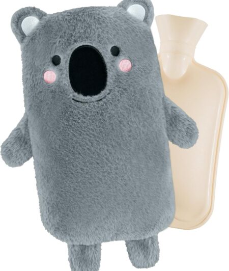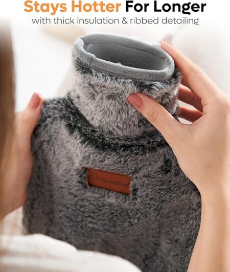 Hot Water Bottle with Fleece Cover – 2L Large Leakproof Hot Water Bag – Soft Hot Water Bottle with Hand Pocket and Natural Rubber -for Hands, Feet, Shoulders, Neck, Abdomen, Legs (Grey)